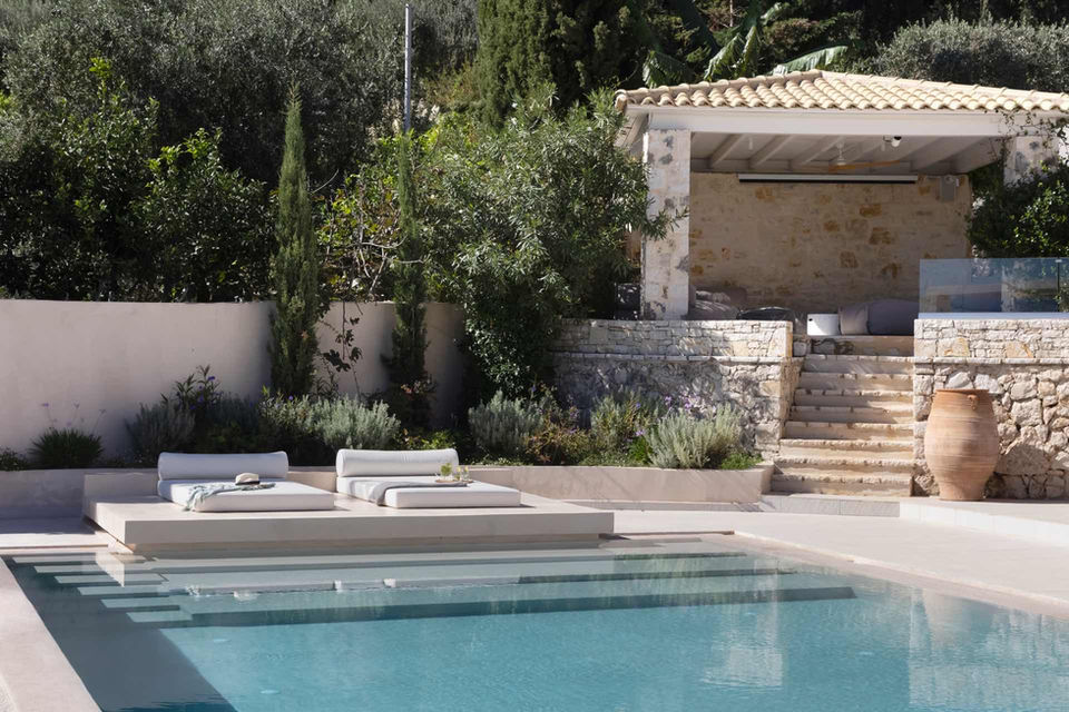 One of the most exclusive luxury villas in Kassiopi, Villa Daniela is a proper queen that overlooks the bay of San Stefano and the carpeted mountains from up high. This lavish property of enthralling ambience can accommodate 14 guests in its bedazzling spaces, interior and exterior. Perfect for a large group of friends comprising of families and couples, the villa’s residents will scatter among the three floors of its main house and the separate guesthouse for 2 featuring a double en-suite bedroom and a living room with kitchenette. Lined with natural stone and fitted with tiled roofs, the villa’s volumes follow the local architecture while its interiors burst with an utterly contemporary mood. Masterfully decorated in cool earthy hues, this stunning luxury villa in Corfu will make you feel at home from the very beginning. The divine panoramic views flood all its interiors and will adorn your every moment outside. The sublime pool terrace hosts a large pool with sunloungers perched right at the rim of the property, almost floating above the Ionian Sea. A pergola shaded sitting and dining area right outside the living room along with a well-appointed, separate dining area at the edge of the villa’s courtyard will host your dinners under the glittering night sky. Daniela is also one of the top Corfu villas with private chef that will prepare breakfast and one daily meal using raw materials from the property’s organic garden. Are you ready to delve into a world of wonders? Fitted with top quality furnishings, luxurious amenities and cutting-edge equipment, the residence will cater for your every need, whatever that is. The main house hosts 2 double bedrooms and 1 twin, all with private shower bathrooms on the top level and a double en-suite bedroom as well as a twin one on the ground floor. A bright space with a cozy living room, dining area and a fully equipped kitchen opens to the brilliant pool terrace and the large courtyard of the villa. The exquisitely designed swimming pool creates a small, adjacent pond creating a distinctive ambience for guests to relax and unwind in a refreshing ambience. Built-in lounging beds and surrounding sun loungers will embrace you after an invigorating plunge. Several wooden pergolas providing shade to sitting and dining areas blend magically with the natural setting while the outdoor barbeque and open-air bar will invite you to enjoy unforgettable evenings with family and friends.